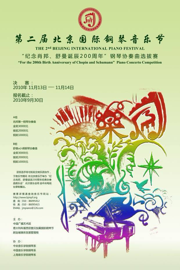 由中國廣播藝術團和意大利布雷西亞暨貝加莫國際鋼琴節組委會聯合主辦的第二屆北京國際鋼琴音樂節于2010年11月18日到29日在北京舉行。為期12天的北京國際鋼琴音樂節以“心感動 樂人生”為主題,推出紀念肖邦、舒曼誕辰200周年鋼琴協奏曲選拔賽,12場大師音樂會,大師見面會等一系列活動。包括陳薩、莉莉亞·齊柏絲、杰哈德·歐匹茲等在內的來自世界各地的10余位頂級鋼琴大師聯手獻上精彩演出。