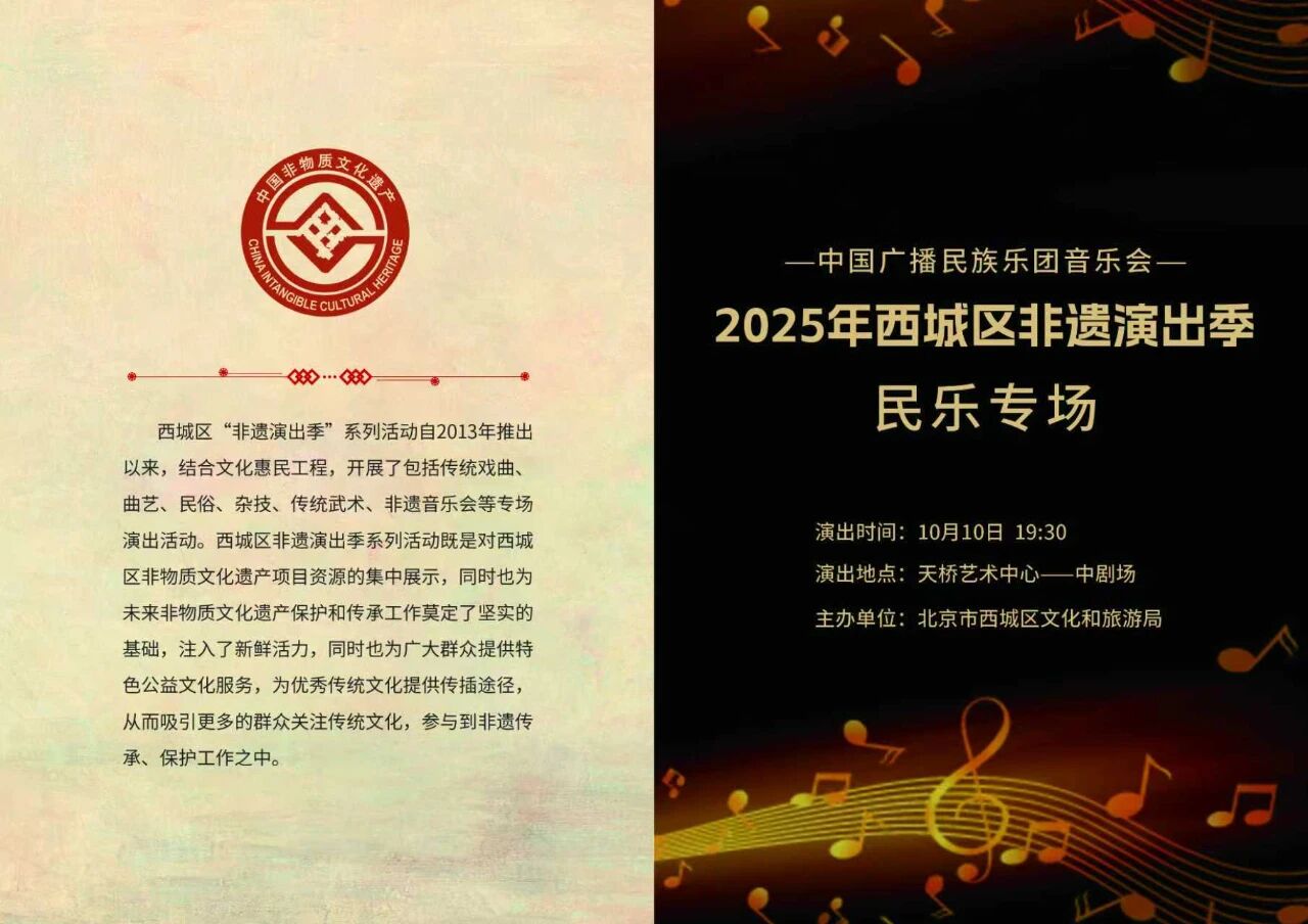 作為西城區非遺演出季的重要組成部分,本場音樂會承載著獨特的文化使命。西城區非遺資源豐厚,數百項各級非遺保護項目構筑起深厚的文化根基,而本次民樂專場正是對傳統音樂類非遺的鮮活傳承。它既延續了演出季“弘揚中華優秀傳統文化、豐富群眾精神文化生活”的公益初心,更是以國樂為筆、非遺為墨,奏響文化傳承的強音。國家級樂團用精湛技藝讓非遺樂曲“活”出廣播新聲,既串聯起中華文脈的千年記憶,也展現了西城非遺“守正創新”的鮮活姿態。讓大眾在旋律中觸摸非遺溫度,對話民樂經典,用心感受中華民族優秀傳統文化的生生不息。